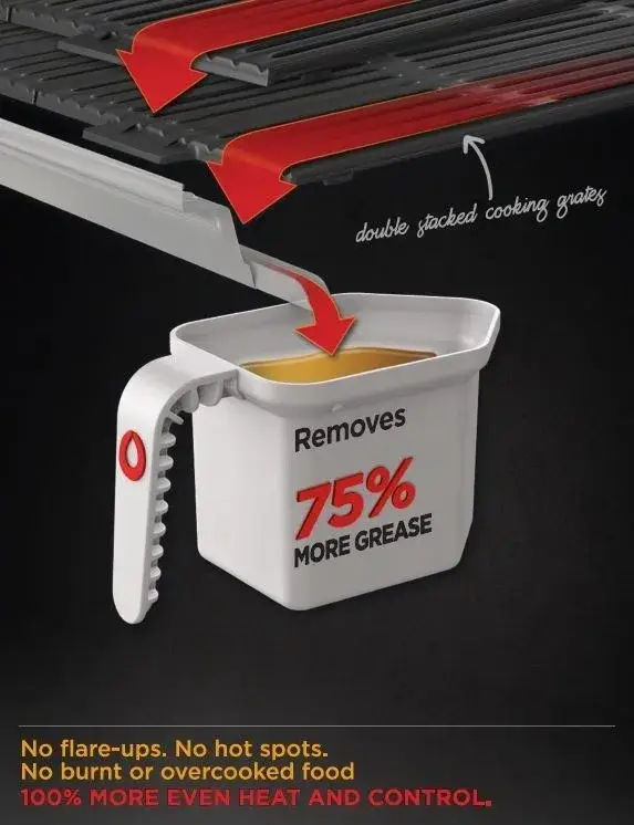 Double-stacked cooking grates offer double heat retention while capturing and redirecting all fats and grease to the removable front grease cup.